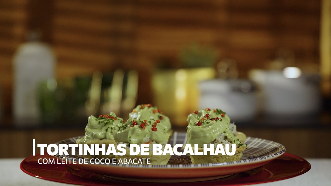 Recheie as forminhas com o recheio de bacalhau e, por cima, espalhe a cobertura de abacate.